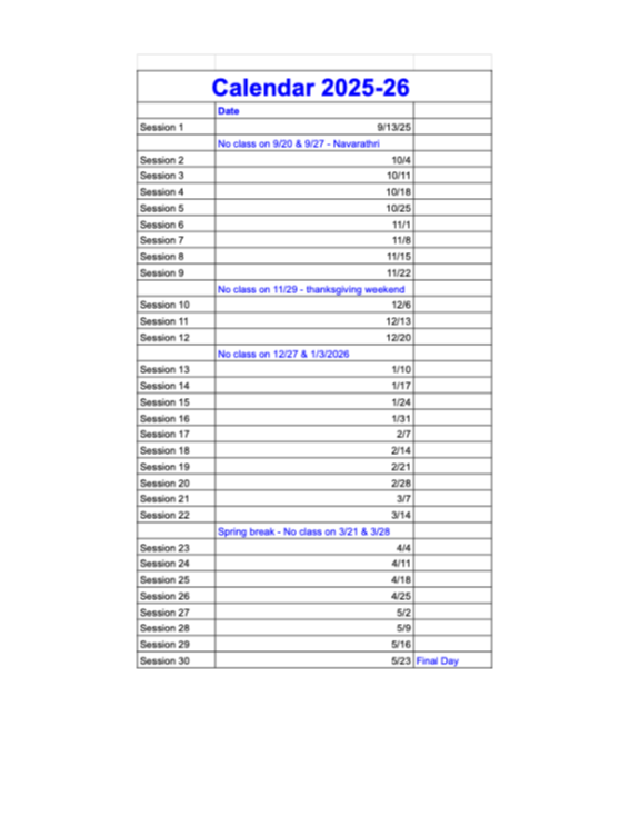 The school year will be following the regular US school calendar year, except starts with Vijayadasami (or the Saturdays near Vijayadasami day) and ends by Memorial Day.