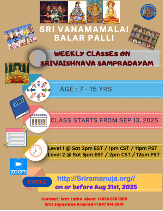 Sri Vanamamalai Balar Palli USA is organizing the virtual weekend classes “Sri Vanamamalai Balar PaLLi” for kids aged 5 to 15 years in North America (USA & Canada). This is to teach the younger generation about our Sri Vaishnava Sampradayam, Azhwars and Acharyas in a simple and easy way, along with the stories and Kahoot Quizzes.